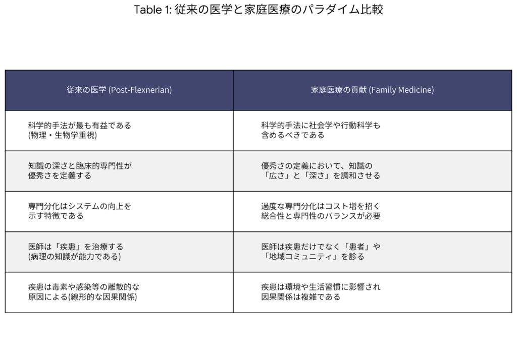 しかし家庭医療はこれまでの40年間は他の医師に受け入れられるためだけに従来のflexnerパラダイムの中にこれらを無理矢理適合させようとしてきた.もし我々の目標がアメリカの健康を改善することだけであればそういった妥協もやむを得ないかもしれないが,もし我々の目指すことが,新しいパラダイムの創出であるならば,妥協をしすぎたのではないか.