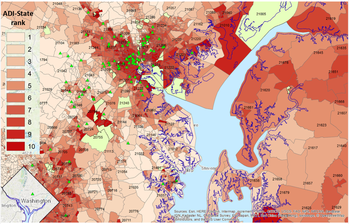 プレプリントなので注意が必要ですが、郵便番号ごとの区域 x 地域剥奪指数(ADI: 図の色の10段会)濃淡 x COVIDの患者(黄緑の三角)で地図に表示というGIS(地図情報システム)を用いたhotspotting。