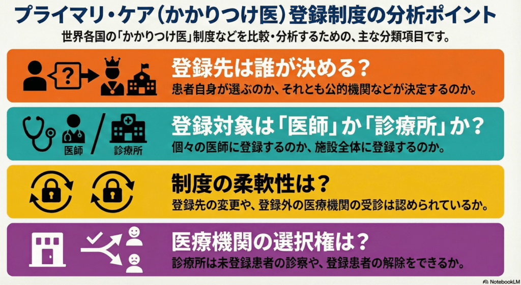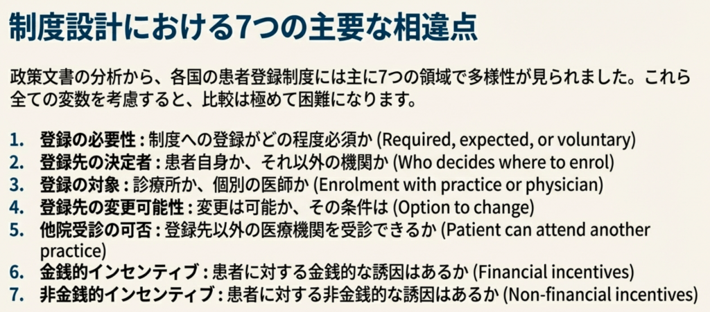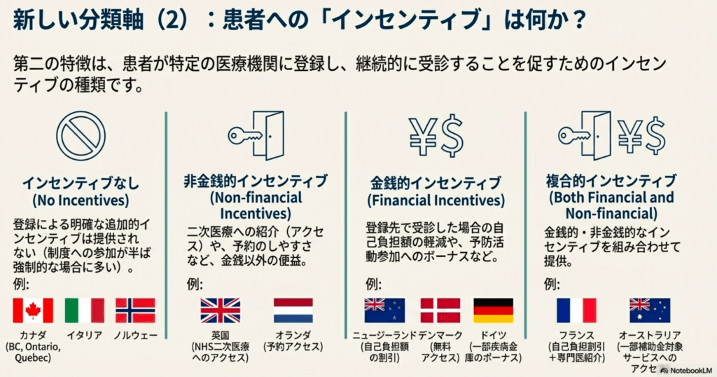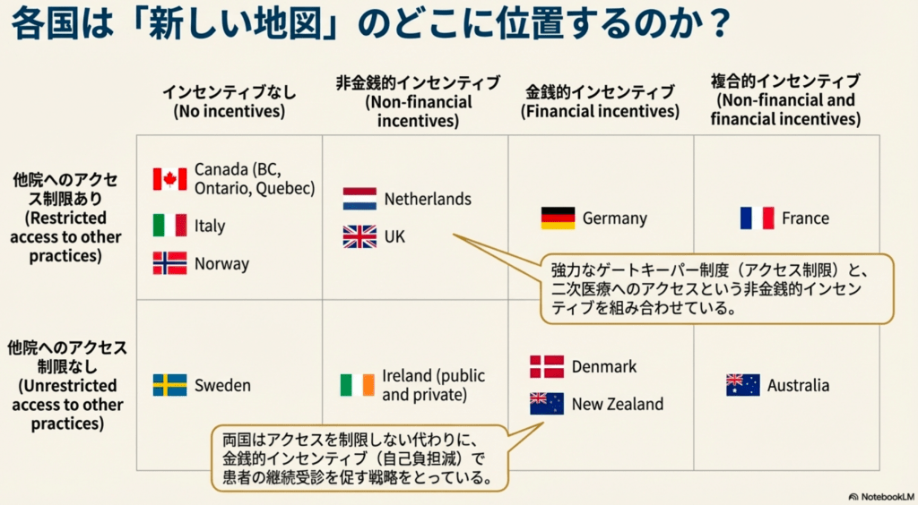 - 費用の差別化: デンマークでは登録先での診療は無料だが、他院受診には自己負担が生じる。ニュージーランドやフランスでは登録先でも自己負担はあるが、登録先以外の受診では自己負担額が高くなる。