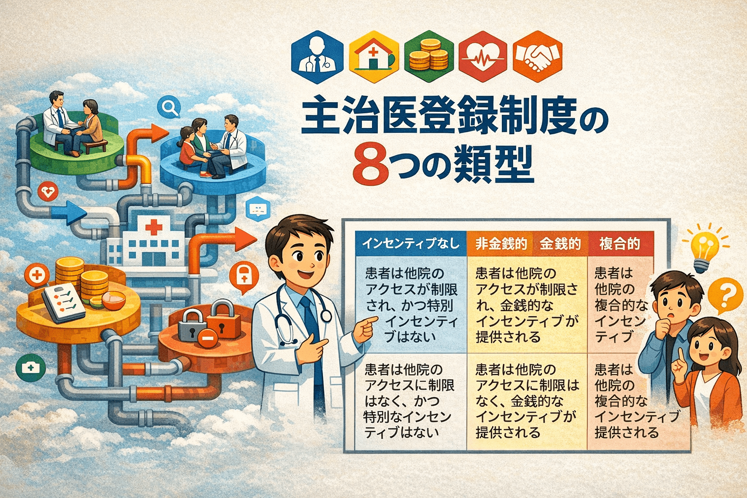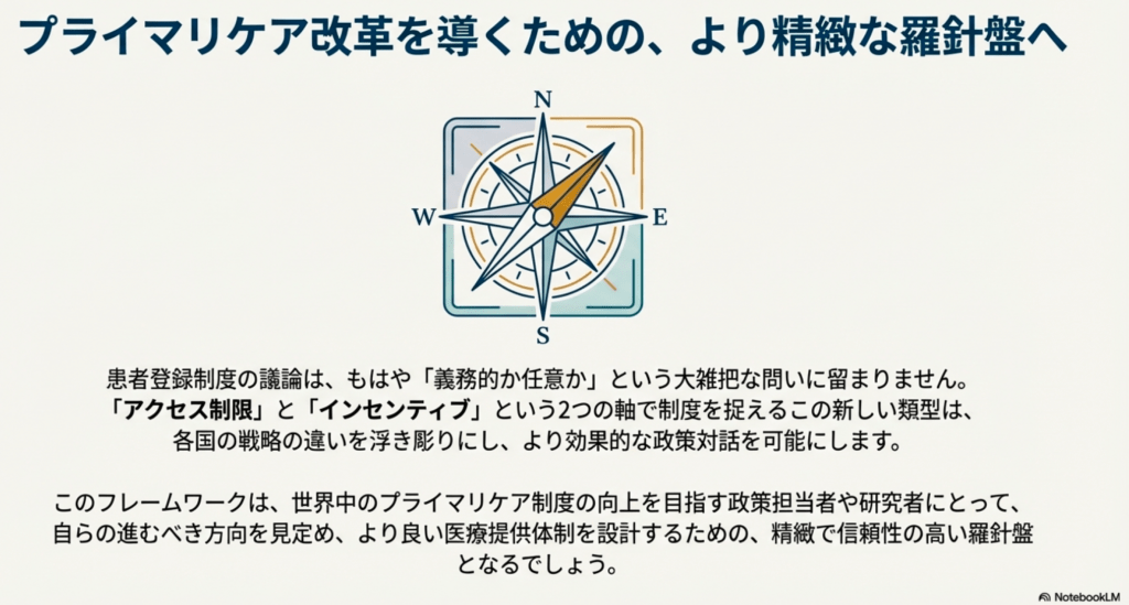 Marchildonらの枠組み(義務性・提供者選択・インセンティブ)に対し、本研究では「患者が他の診療所を利用できるか」と「登録・受診に関するインセンティブの有無」という2変数を重視し、より実態に即した類型を提案した。今後は、これらのインセンティブや期待水準(なし・最小限・厳格)の強度を定量的に評価する研究が必要である。