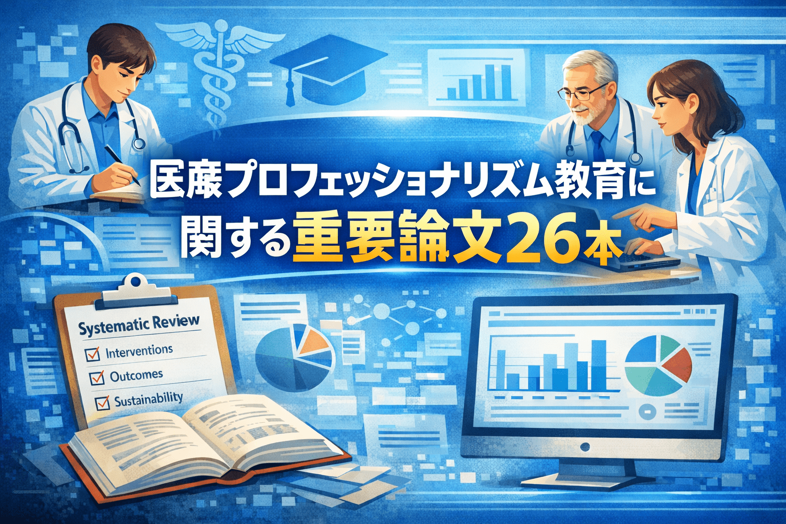 医学生向けプロフェッショナリズム教育に関する8本のシステマティックレビューをまとめたアンブレラレビュー。介入の種類とアウトカム、持続性や標準化の課題を整理。