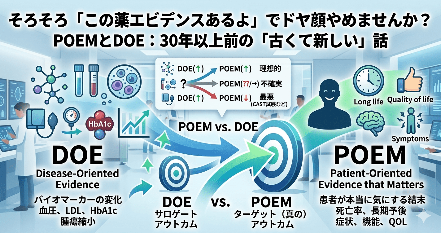 - 1990年代:ASCOTなど大規模アウトカム試験が行われ、「長期のPOEMを直接見るRCT」が現実化し、サロゲート批判とDOE/POEMの区別が強まる。
