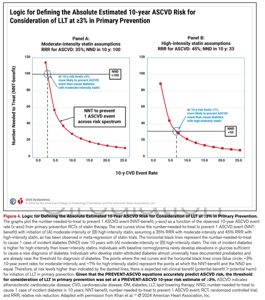 Panel B: 高強度スタチンの場合、NNDが33(!)のためNNT <33のレベルでないと1人のイベントを防ぐより先に糖尿病の発症を増やすため。リスクとベネフィットの拮抗点が10年リスク7%。