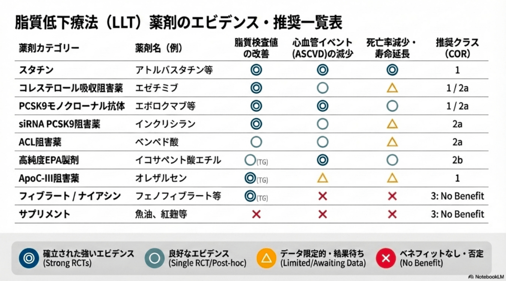結果として、ロスバスタチンはLDL-Cを約35%低下させたのに対し、いずれのサプリメントもLDL-Cをプラセボより有意に下げなかった。 有効性だけでなく、一部サプリで不利な変化もみられたことから、ガイドラインはLDLやTG低下目的のサプリ使用を「COR 3: No Benefit」とし、推奨しない立場を明確にしている。
